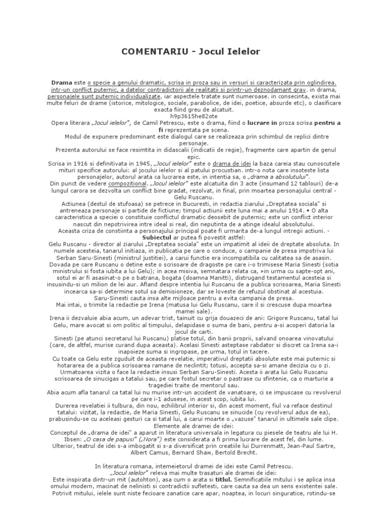 Jocul Ielelor De Camil Petrescu. Camil petrescu propune o creaţie literară autentică, bazată pe experienţa trăită a autorului şi reflectată în propria conştiinţă: Please copy and paste this embed script to where you want to embed. Camil petrescu jocul ielelor regia paul stratilat. Jocul ielelor de camil petrescu. Actiunea dramei jocul ielelor se petrece in preajma izbucnirii primului razboi mondial, in mai 1914, la redactia ziarului bucurestean dreptatea sociala.