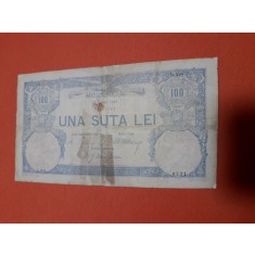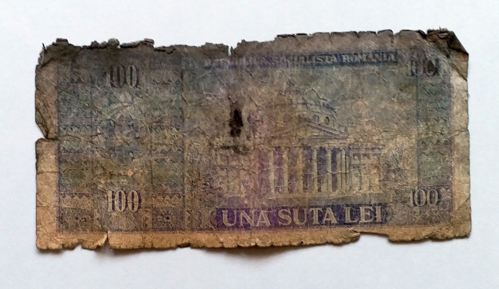 Bancnota de 100 lei din perioada comunista. Bancnotele erau din hârtie, cea mai mică valoare având 10 lei, iar cea mai mare, 100 de lei.